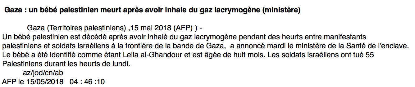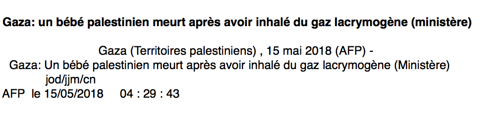 Le 15 mai 2018, à 6 h 29 du matin, l’AFP diffuse sur son fil le « bulletin » suivant :