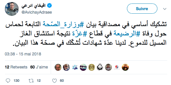 Dès le 15 mai, à la mi-journée, l’un des porte-paroles de Tsahal, Avichay Adraee, publie sur son compte tweeter ce message en arabe où il conteste la version des Palestiniens.