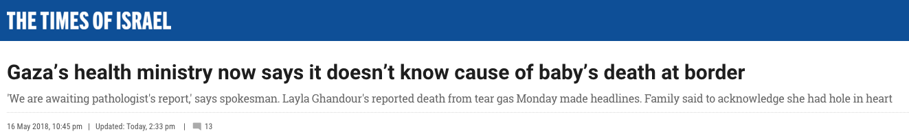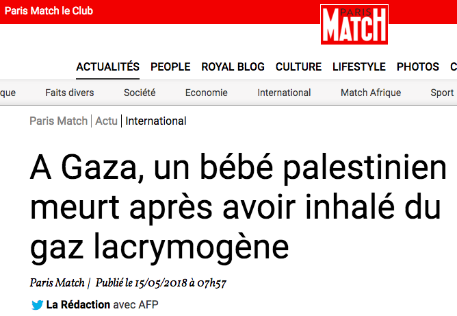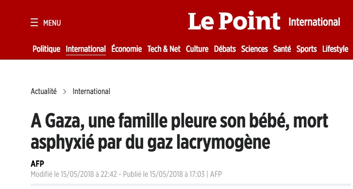 L’agence américaine Associated Press, homologue de l’AFP, relaie ces doutes : « Des responsables de la santé à Gaza jettent un doute sur les affirmations initiales selon lesquelles un bébé de 9 mois était mort de gaz lacrymogènes israéliens tirés pendant des manifestations de masse à la frontière de Gaza avec Israël. Un médecin a dit mardi que le bébé, Layla Ghandour, avait une condition médicale pré-existante et qu’il ne pensait pas que sa mort avait été causée par des gaz lacrymogènes. »